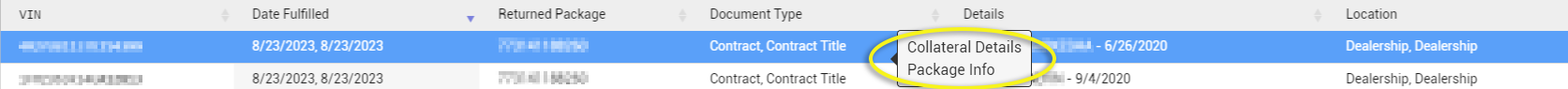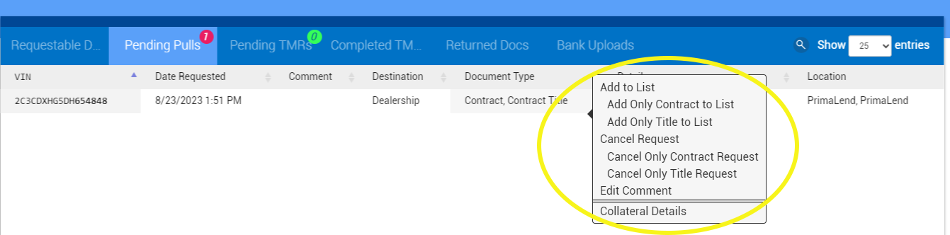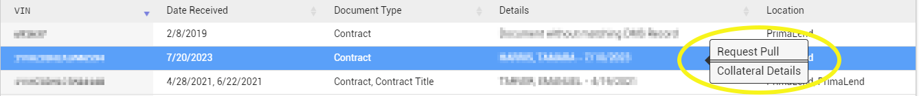 When you click on a row in the table it will open a menu with the available actions you can take. This menu will allow you to see the details of this piece of collateral, or request a pull or TMR if applicable.